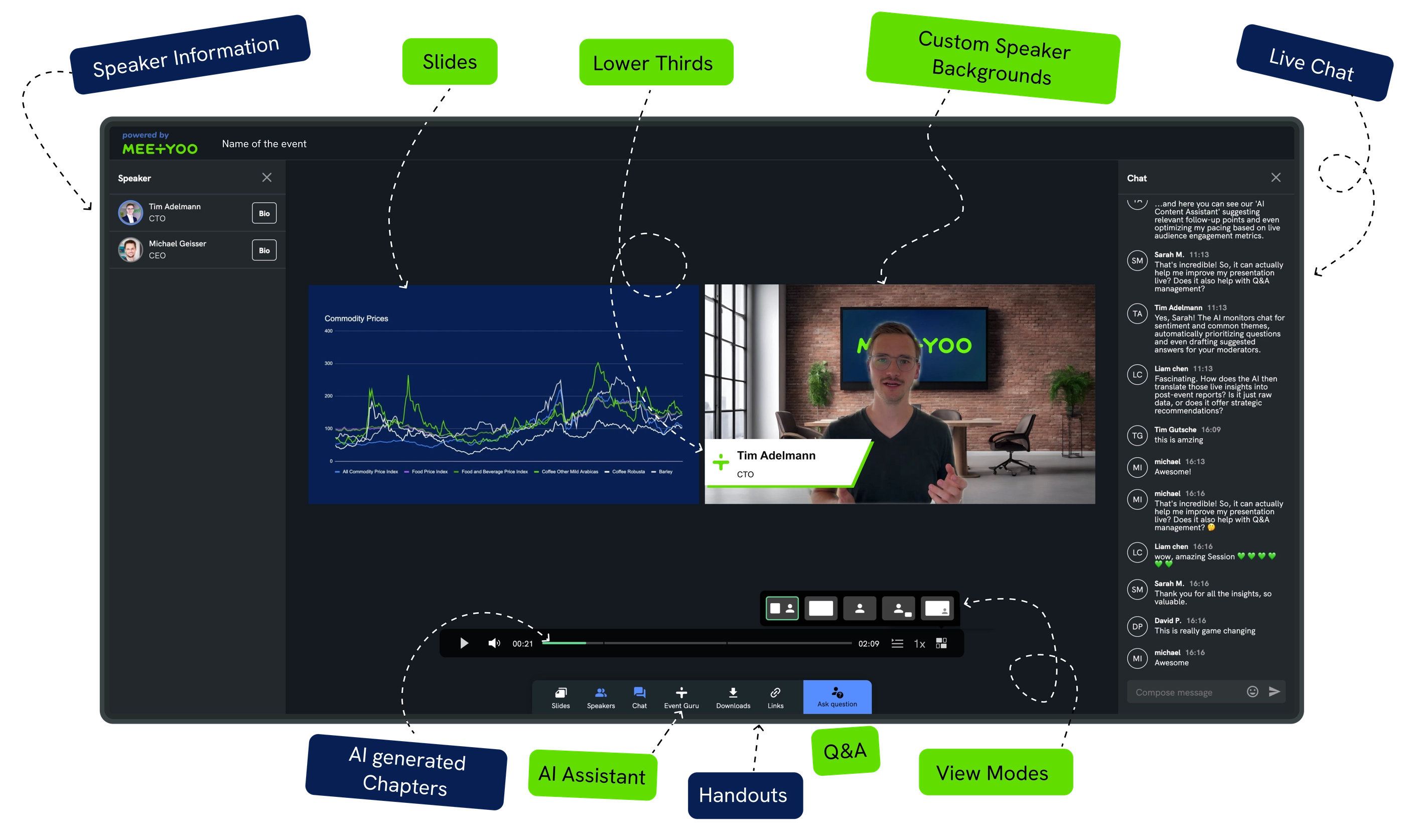 MEETYOO Show includes a comprehensive suite of engagement tools: interactive Q&A sessions, live polls and surveys, moderated chat with AI support, emoji reactions, and interactive elements like quizzes. These features help maintain audience attention and collect valuable feedback during your events.
